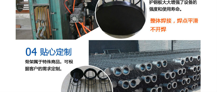 除塵器骨架也稱除塵袋籠,是濾袋的“肋骨”,采用專用設(shè)備一次焊接成型,材質(zhì)為鐵絲或不銹鋼絲,表面后處理采用鍍鋅、噴塑、有機(jī)硅等方式。除塵器骨架/袋籠分為:直徑125、160、250三種,長度按要求定做。
