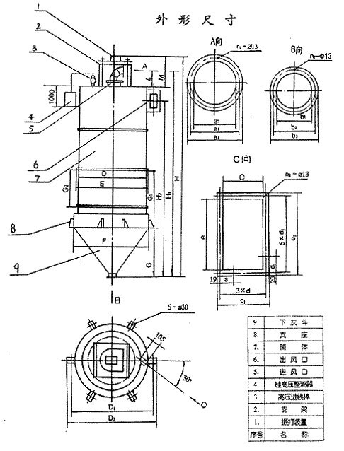 含塵氣體從設(shè)備頂部進(jìn)風(fēng)口進(jìn)入設(shè)備后,以高速經(jīng)過旋風(fēng)分離器,使含塵氣體沿軸線調(diào)整螺旋向下旋轉(zhuǎn),利用離心力,除掉較粗顆粒的粉塵,有效地控制了進(jìn)入電場的初始含塵濃度。然后,氣體經(jīng)下灰斗進(jìn)入電場工作,由于下灰斗截面積大于內(nèi)管截積數(shù)倍,根據(jù)旋轉(zhuǎn)矩不變?cè)恚瑥较蝻L(fēng)速和軸向風(fēng)速急劇降低產(chǎn)生零速界面而使內(nèi)管中的重顆粒粉塵沉降于下灰斗內(nèi),降低了進(jìn)入電場的粉塵濃度,低濃度含塵氣體經(jīng)電收塵而凝聚在陰陽極板上,經(jīng)清灰振打而將收集的粉塵由鎖風(fēng)排灰裝置輸送走。為了防止內(nèi)管旋風(fēng)和電場極板振打后在下灰斗內(nèi)形成的二次揚(yáng)塵,特在下灰斗中設(shè)置了隔離錐。