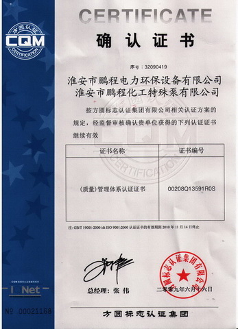 近日,方圓標志認證集團有限公司向我公司頒發了2009年度質量確認證書,這標志我公司自去年7月獲得ISO9001:2000質量貫標認證證書以來,我公司各項指標符合質量管理要求,質量管理持續、充分、有效,這對規范公司管理,進一步提高我公司管理水平具有積極作用。