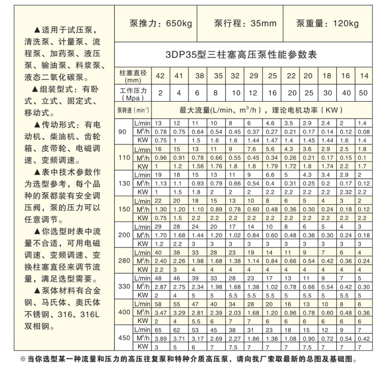 優勢:三柱塞高壓往復泵是工業泵中不可缺少的一類產品。它的突出優點是:可獲得高的排出壓力,且流量與壓力基本無關,適應輸送介質十分廣泛,吸入性能好,效率高,泵的性能不隨壓力和輸送介質粘度的變動而變動。在當今世界能源緊缺的形勢下,往復泵作為節能產品,在石油開發、管道輸煤、煤氣化工、電站排渣、礦山開采等方面起著重要作用,而且在壓力容器檢測和實現現代化石油化工工業全面自動化操作方面也是不可缺少的品種。