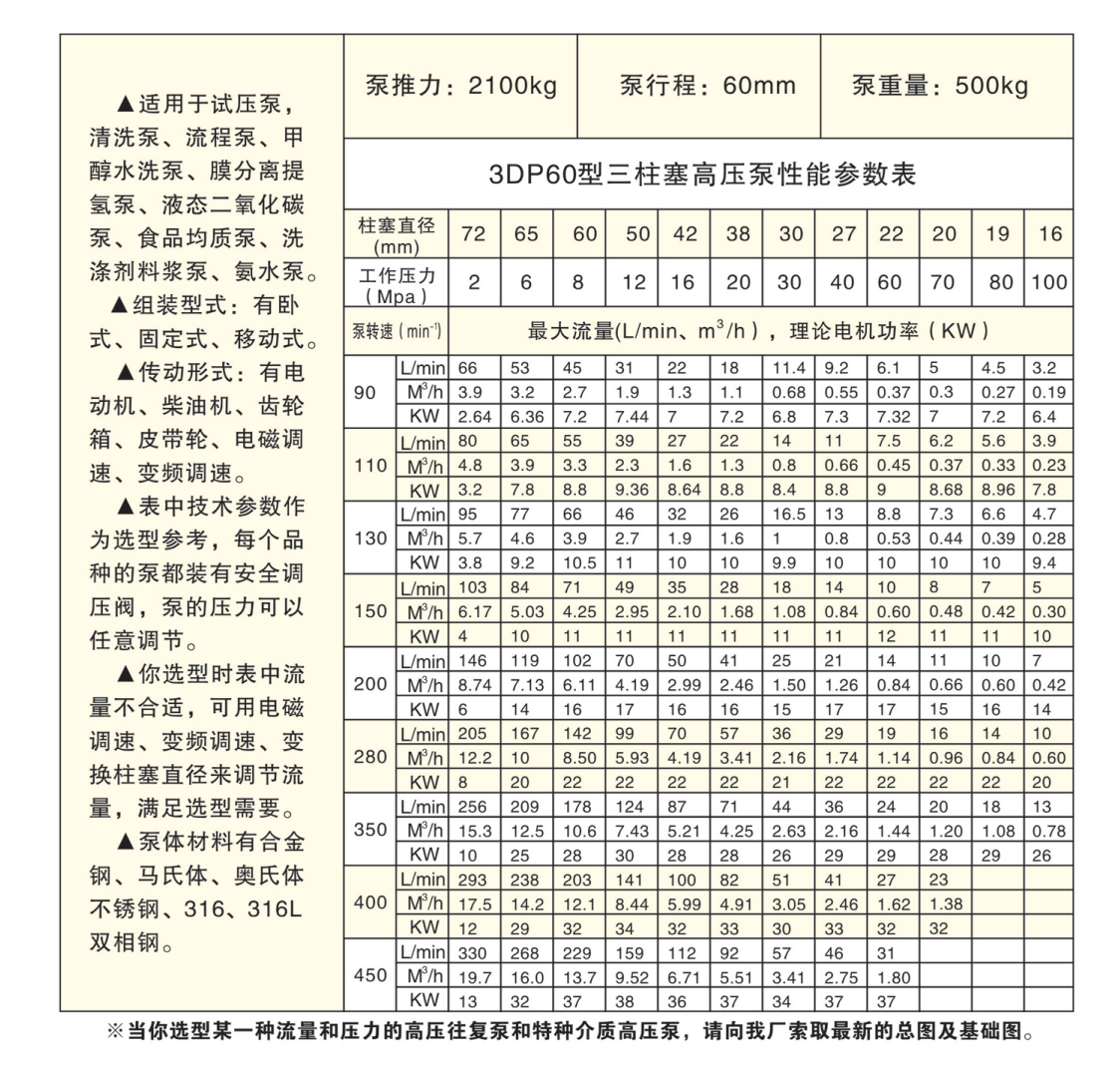 優勢:三柱塞高壓往復泵是工業泵中不可缺少的一類產品。它的突出優點是:可獲得高的排出壓力,且流量與壓力基本無關,適應輸送介質十分廣泛,吸入性能好,效率高,泵的性能不隨壓力和輸送介質粘度的變動而變動。在當今世界能源緊缺的形勢下,往復泵作為節能產品,在石油開發、管道輸煤、煤氣化工、電站排渣、礦山開采等方面起著重要作用,而且在壓力容器檢測和實現現代化石油化工工業全面自動化操作方面也是不可缺少的品種。