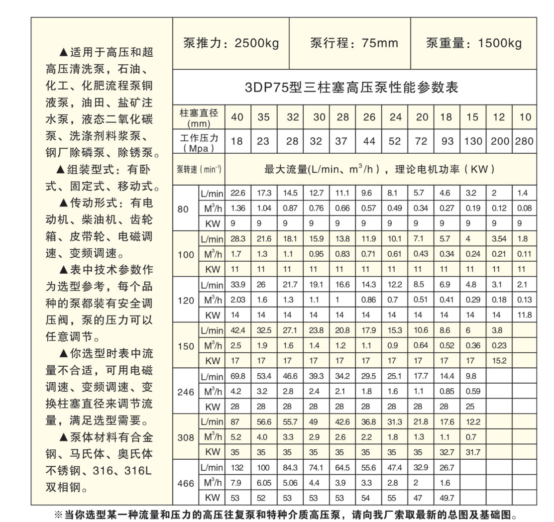 優勢:三柱塞高壓往復泵是工業泵中不可缺少的一類產品。它的突出優點是:可獲得高的排出壓力,且流量與壓力基本無關,適應輸送介質十分廣泛,吸入性能好,效率高,泵的性能不隨壓力和輸送介質粘度的變動而變動。在當今世界能源緊缺的形勢下,往復泵作為節能產品,在石油開發、管道輸煤、煤氣化工、電站排渣、礦山開采等方面起著重要作用,而且在壓力容器檢測和實現現代化石油化工工業全面自動化操作方面也是不可缺少的品種。